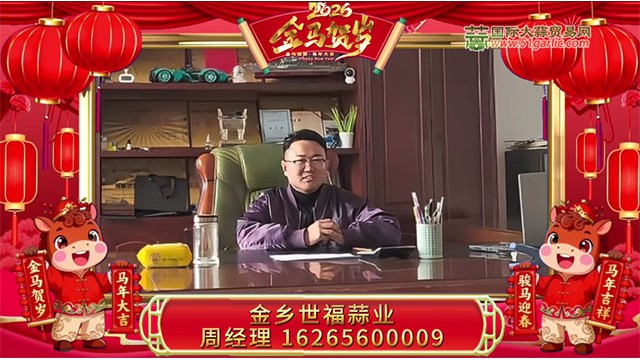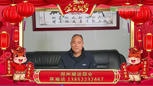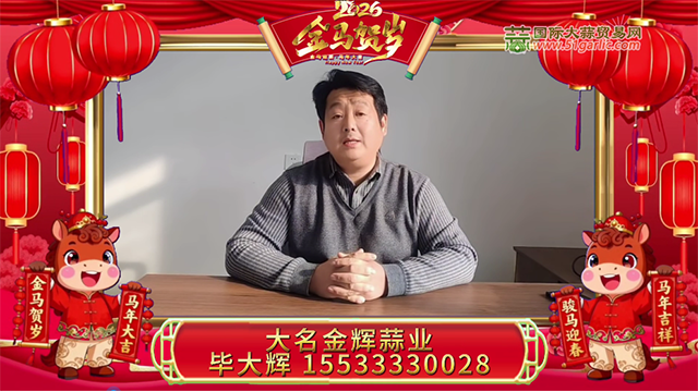 金蛇辭舊歲,駿馬報(bào)新春!值此新春佳節(jié)來臨之際,國際大蒜貿(mào)易網(wǎng)(computepatterns.com)攜大蒜知名企業(yè)及行業(yè)大咖,給全國的蒜界同仁拜年啦!過去一年,我們風(fēng)雨同舟,見證了行情的起伏;新的一年,愿我們繼續(xù)攜手,把握市場脈搏,洞察財(cái)富先機(jī)。祝您在2026 年事業(yè)如駿馬奔騰,勢不可擋;財(cái)運(yùn)如春水奔流,源源不斷!