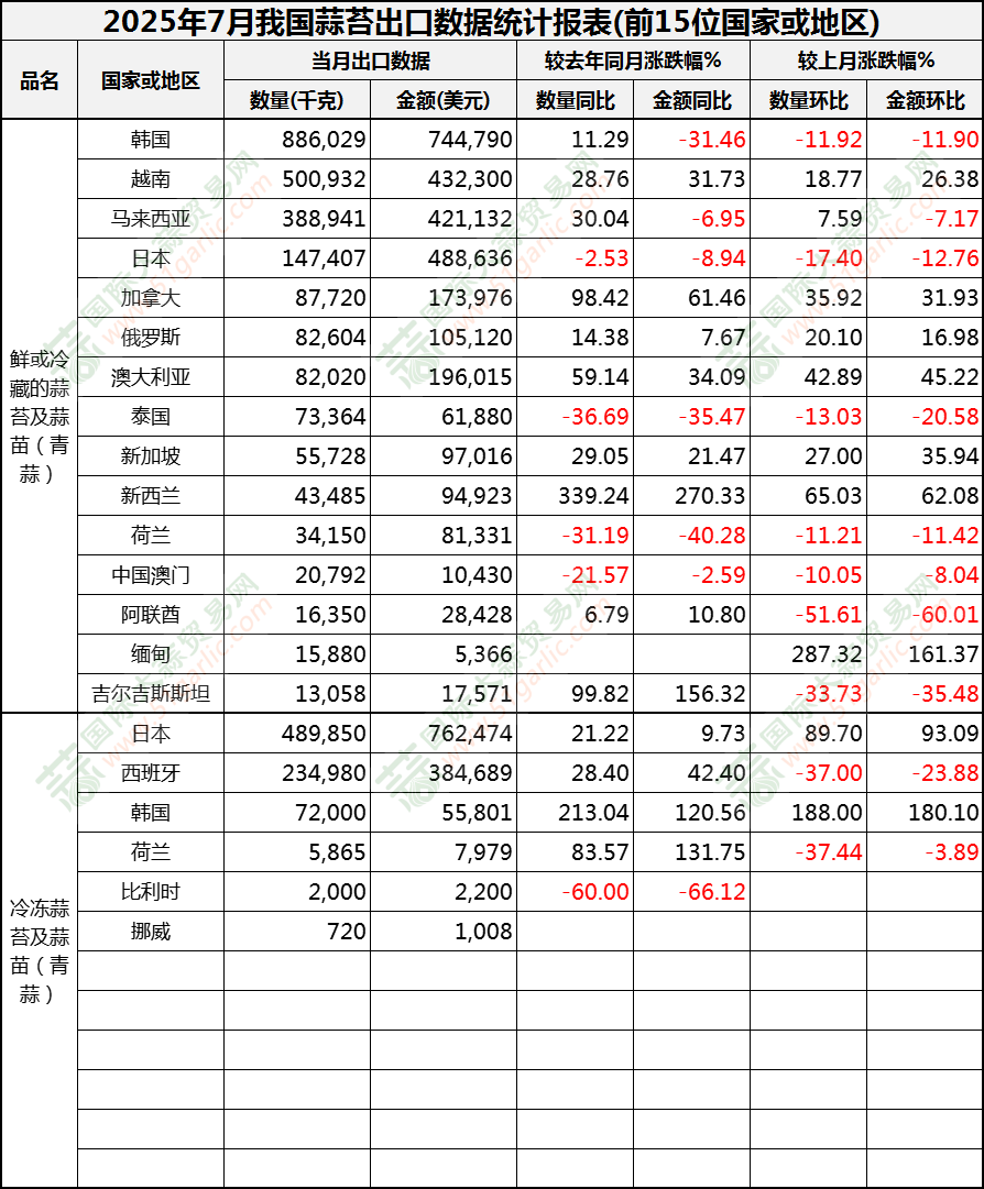 2025年7月蒜苔出口數(shù)據(jù)(按國(guó)家)