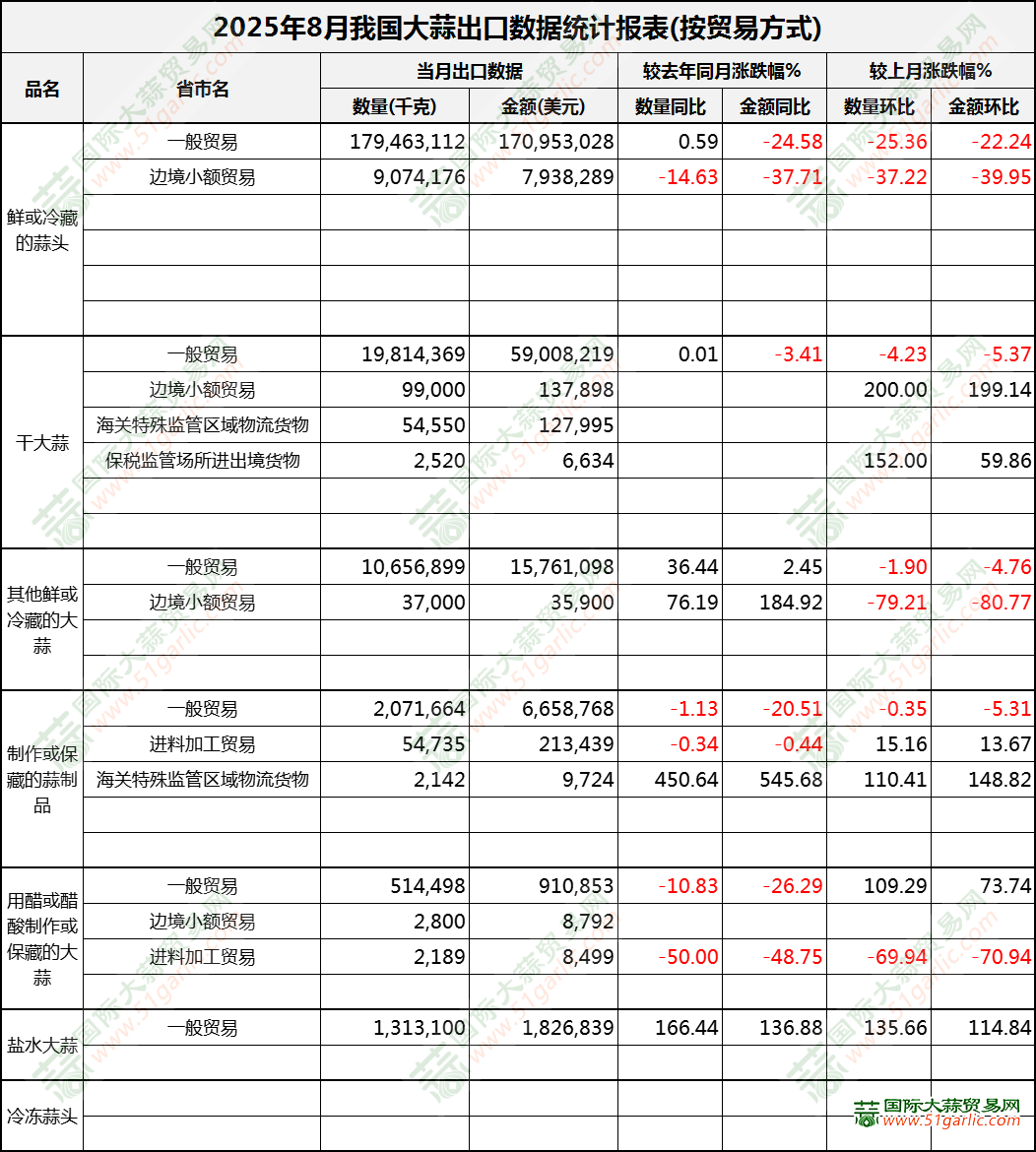 2025年8月大蒜出口數(shù)據(jù)(按貿(mào)易方式)