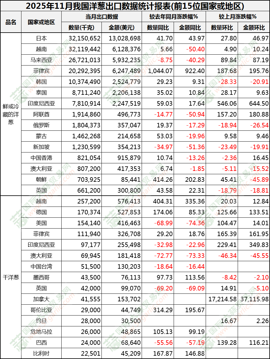 2025年11月洋蔥出口數(shù)據(jù)(按國家)