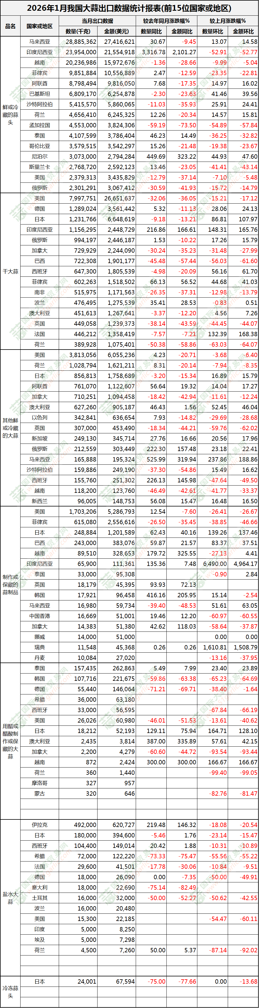 2026年1月大蒜出口數(shù)據(jù)(按國家)