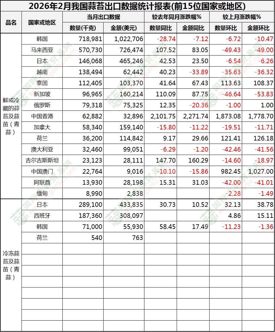 2026年2月蒜苔出口數(shù)據(jù)(按國(guó)家)