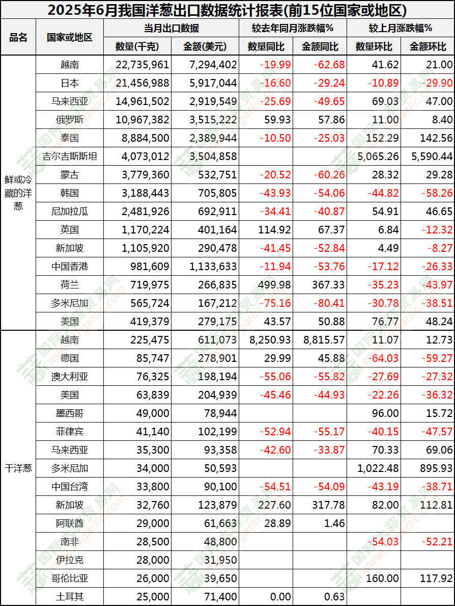 2025年6月洋蔥出口數(shù)據(jù)(按國(guó)家)
