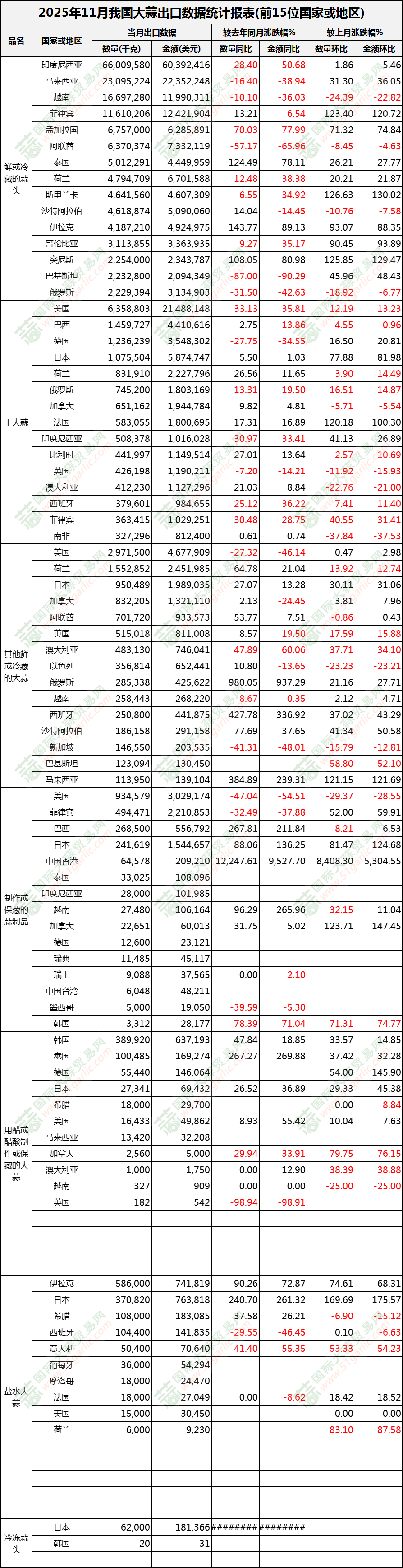 2025年11月大蒜出口數(shù)據(jù)(按國家)
