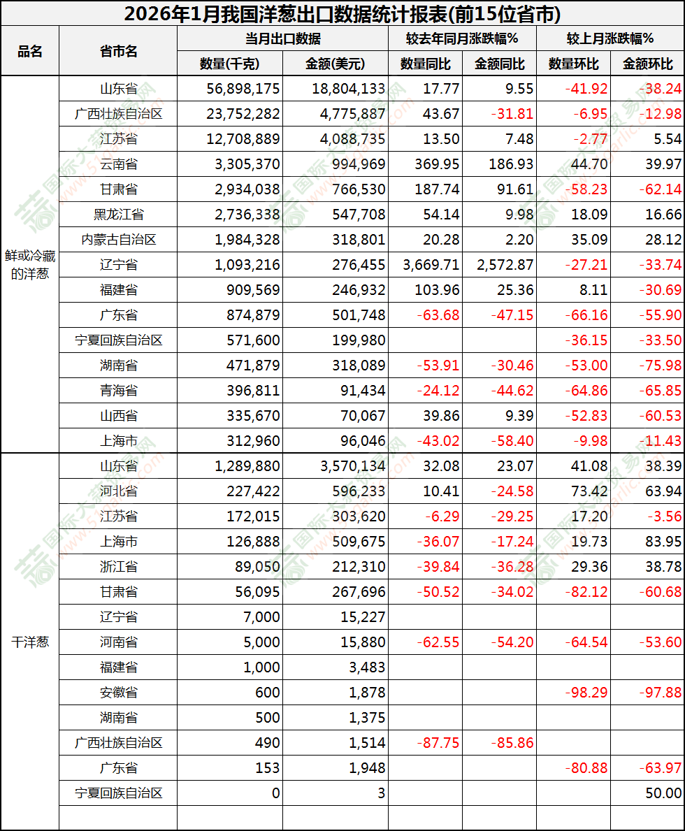 2026年1月洋蔥出口數(shù)據(jù)(按省市)