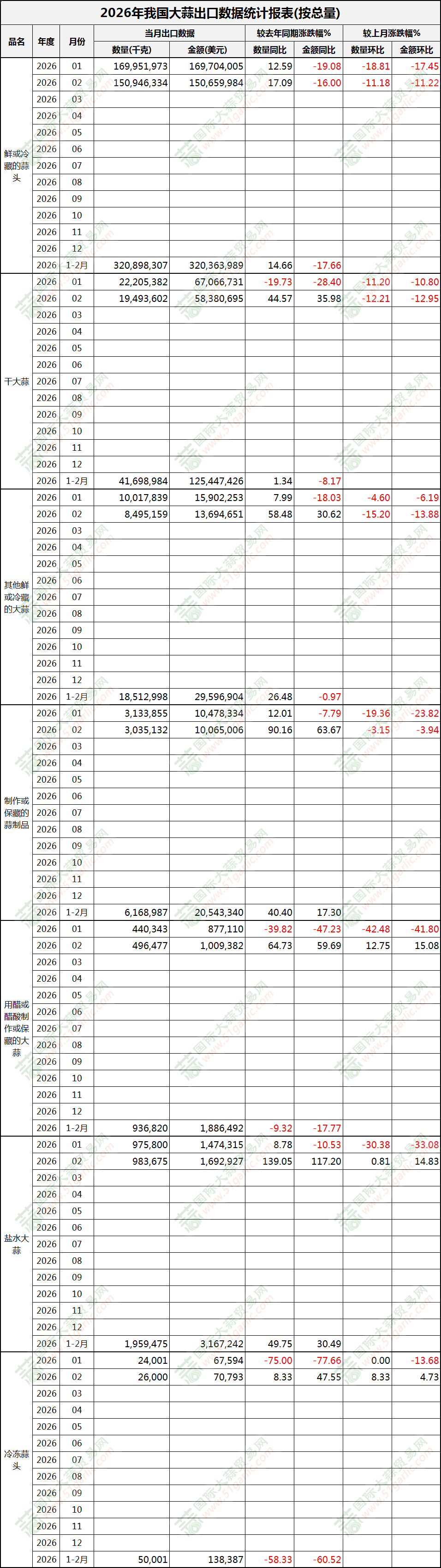 2026年2月大蒜出口數(shù)據(jù)(按總量)
